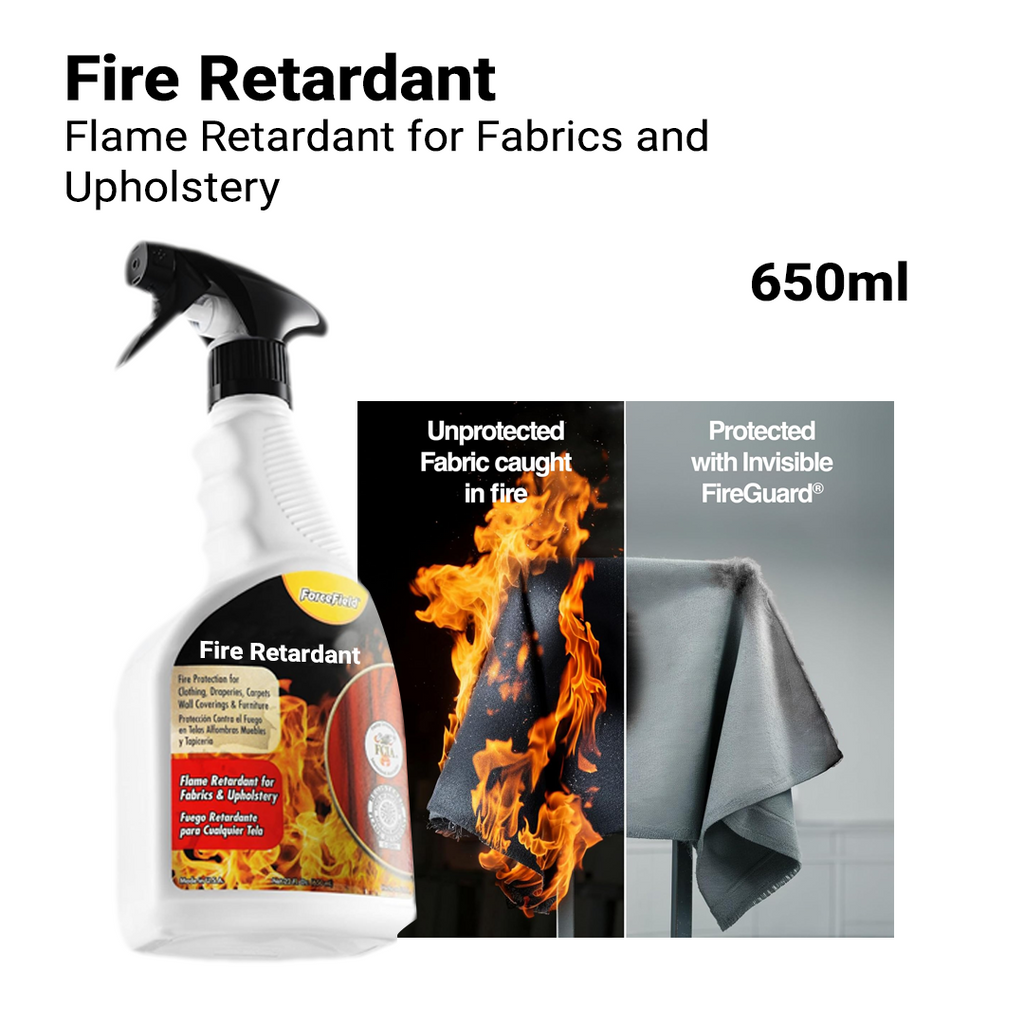 Revolutionary, water-based, flame-retardant treatment that can be easily and safely applied to clothing, draperies, furniture, carpets, rugs, and/or numerous other surface treatments. This product has been successfully tested in accordance with and meets the standards established by National Fire Protection Association Test Method NFPA 701 and Test STD ASTM D4850. The key for its ability to retard flames is its organic ammonium salt formulation. When exposed to flames or intense heat, an acidic catalysis occurs resulting in the formation of an inert gas that blankets the surface. Because of this blanket, there is no oxygen available at the surface and flames cannot form. This fire retardant should only be used on water-safe fabrics and surfaces. If uncertainty exists, always test for suitability by applying the product to a small inconspicuous area of the item and wiping with a white cloth. For best results, apply to clean, dry surfaces. This can be applied either by spraying or dipping. When sprayed, it should be applied at a rate of 88 square feet per 22oz. spray bottle, depending upon the texture of the surface being treated. More absorbent surfaces will require heavier coverage. Cleaning or laundering treated surfaces may remove or dilute the treatment. To assure that item remains flame retardant, this spray should be reapplied after cleaning. Over-spray or spills can be easily cleaned with gentle detergent and water.
